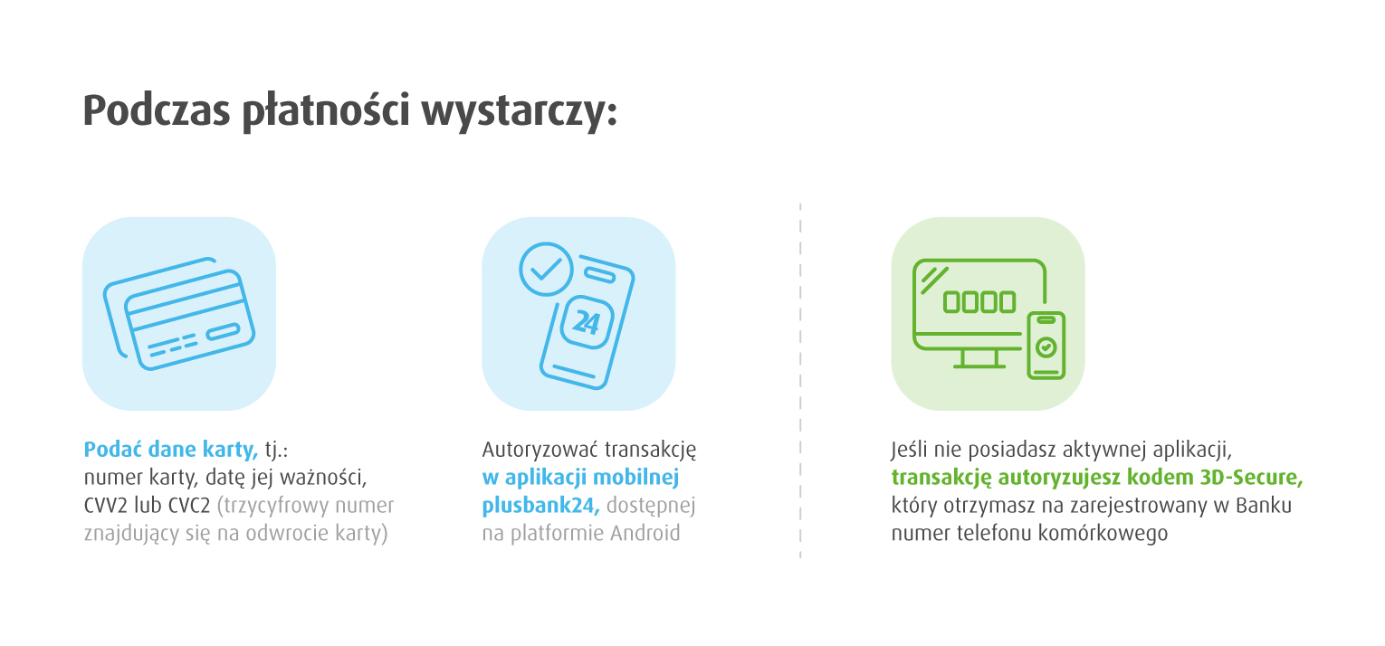 Wszystkie Karty płatnicze wydane przez PLUS BANK S.A. dla klientów indywidualnych mają włączoną usługę 3D-Secure. Oznacza to, że dokonując płatności kartami płatniczymi w sklepach internetowych, które udostępniają usługę 3D-Secure, możesz zostać poproszony o przeprowadzenie dodatkowego potwierdzenia dokonywanej transakcji.